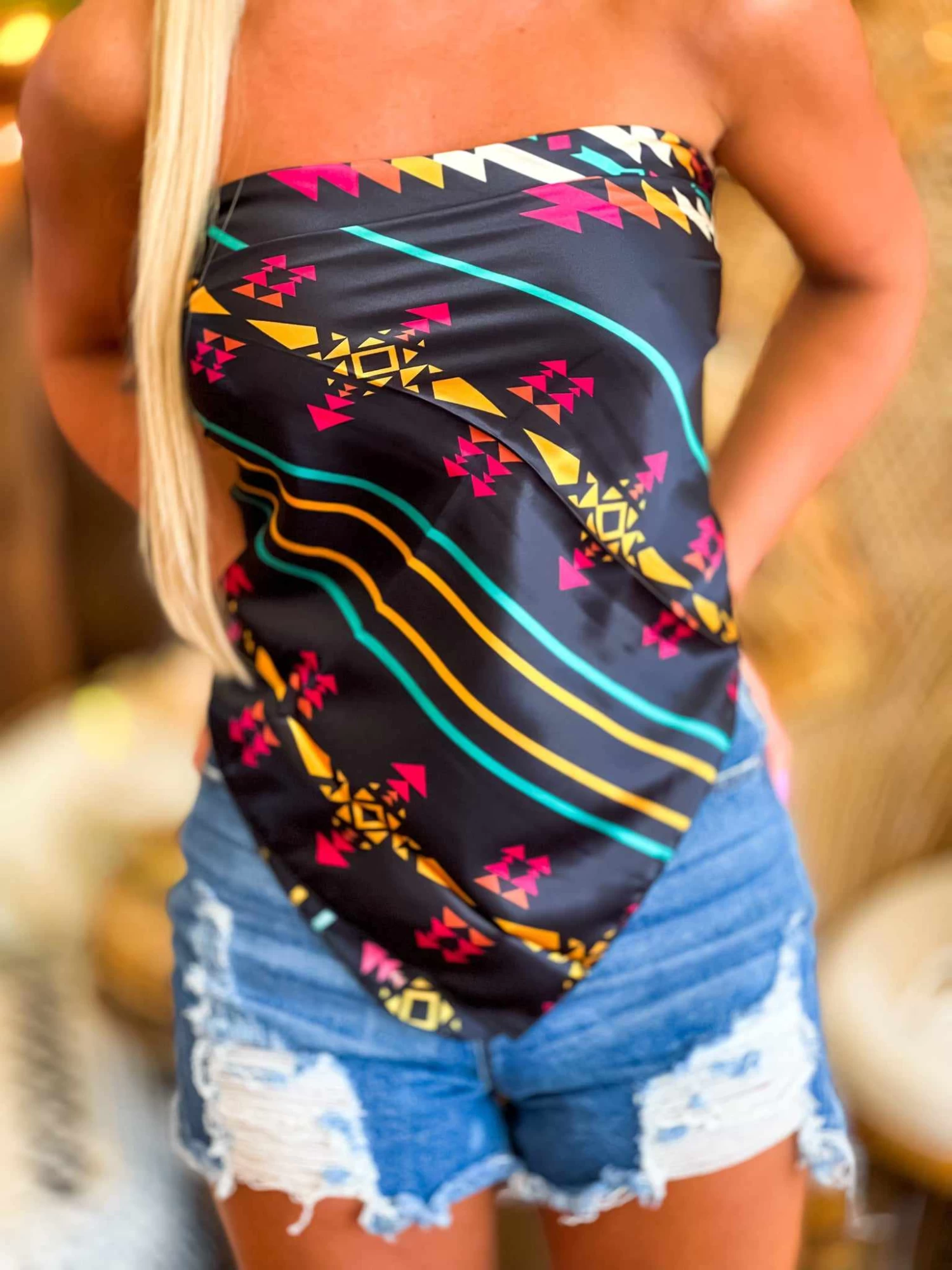 One silk scarf – dozens of ways to style! Wear the apache aztec print silk wild rag as a around your neck or as handkerchief top, bandeau, or bandana! The possibilities are endless! These silk scarfs will be the most versatile piece in your closet!