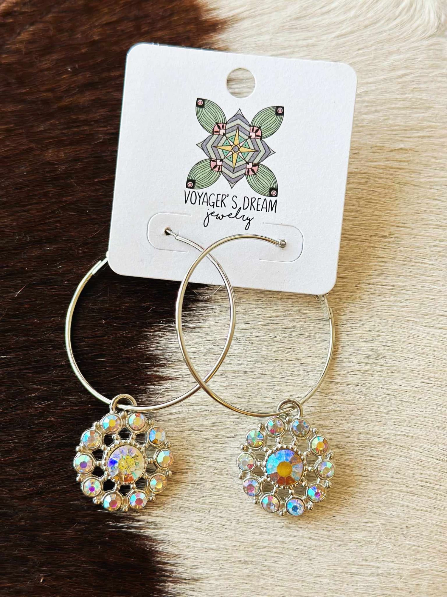 Get your shine on with these sassy Hoop N Holler Silver Rhinestone Earrings! With a classic round hoop style, silver plating and a funky dangling iridescent rhinestone, these earrings are sure to give you all the feels while adding the perfect pop of bling to any outfit. Lightweight enough to keep you rockin’ all night – now go forth and holler!