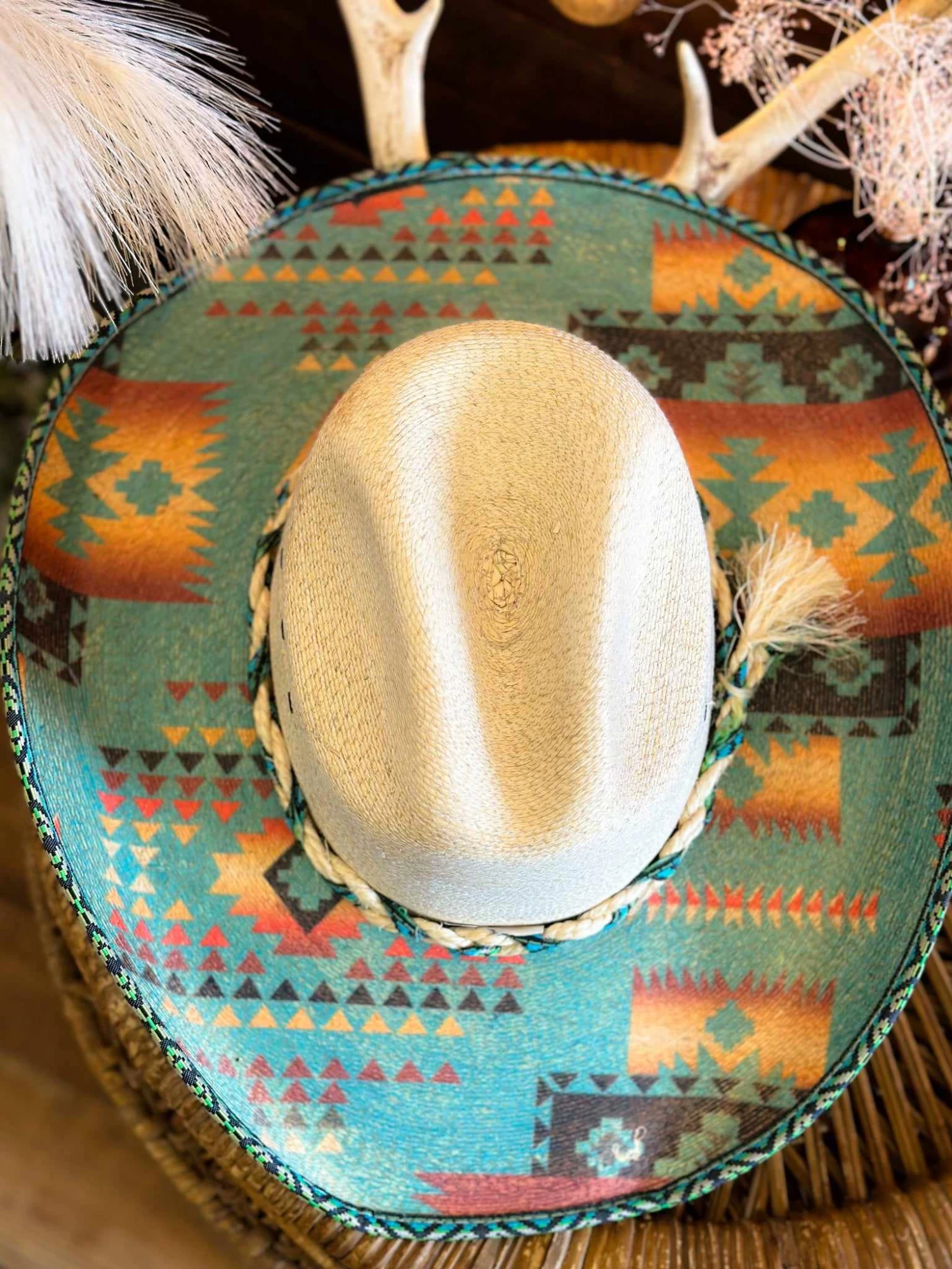 The hat for the summer! This beautiful Western straw cowgirl hat will be a staple for the warmer days and nights! Straw season is here and this is the hat you want! An airy straw hat that features a beautiful printed detail brim with shades of turquoise, red, and gold. It also has an hat band with a unique pattern. So many natural colors to match multiple outfits!