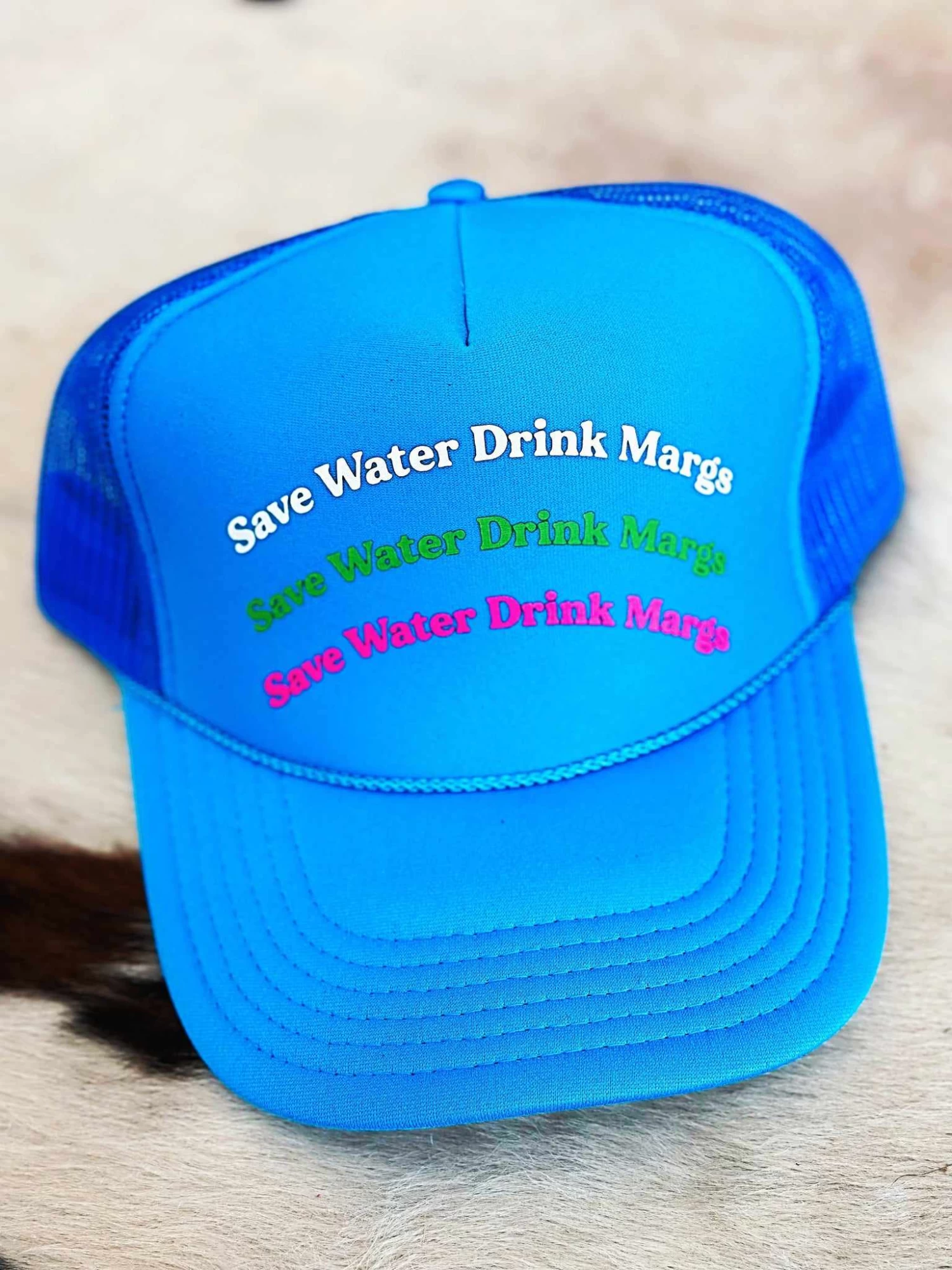 Summer vibes never looked so good! Keep cool during the hot months with our vibrant neon blue Save Water Drink Margs On Repeat Trucker Hat! Featuring the iconic slogan, ‘save water, drink margs’ on repeat, it’s the perfect statement hat for all your summer fun, and adjustable so it fits just right!