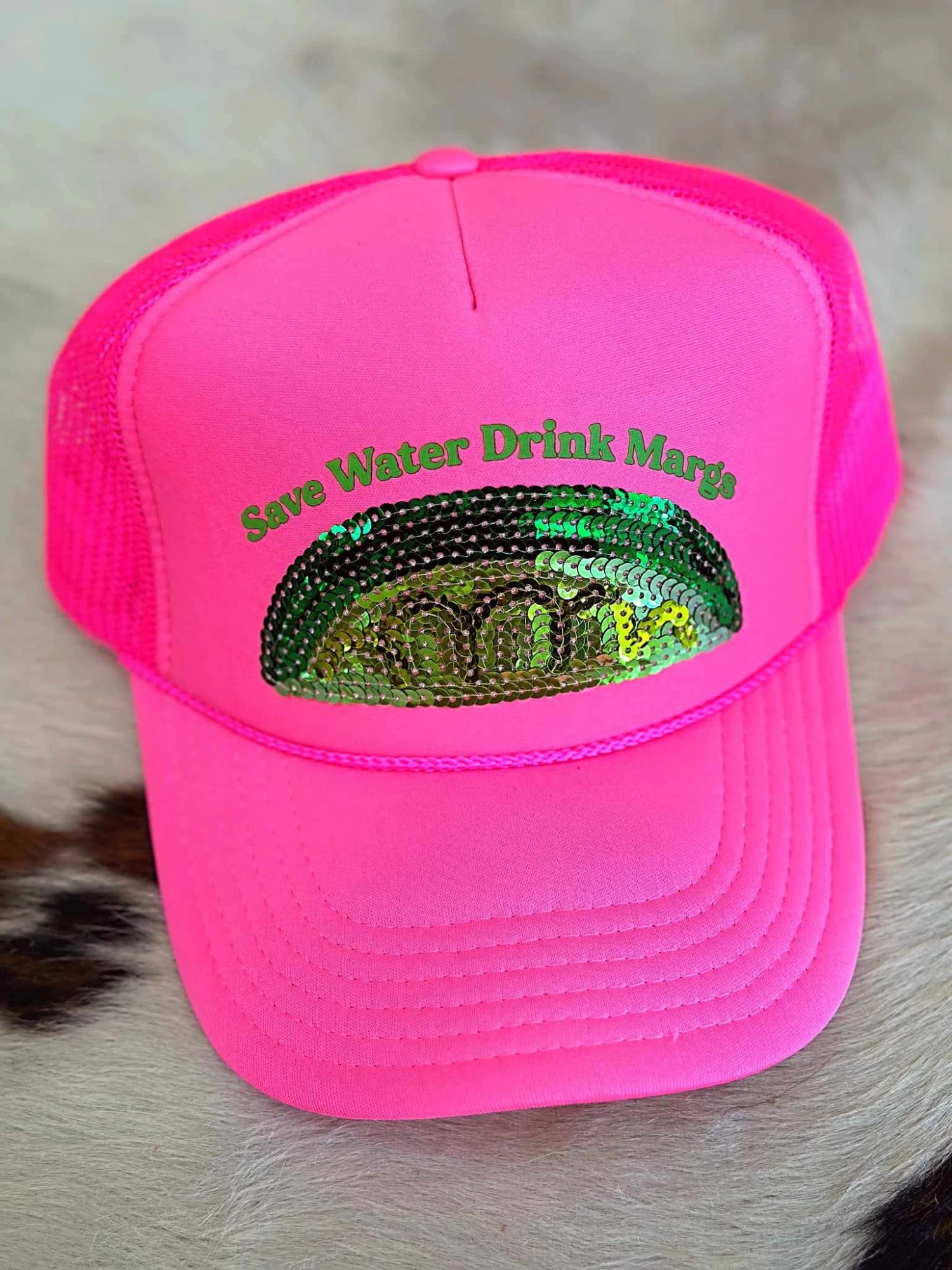 Summer vibes never looked so good! Keep cool during the hot months with our vibrant neon pink Save Water Drink Margs Trucker Hat! And not to mention the sequin lime patch is the perfect final touch to this hat! Featuring the iconic slogan, ‘save water, drink margs’, it’s the perfect statement hat for all your summer fun, and adjustable so it fits just right!