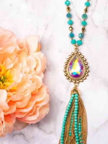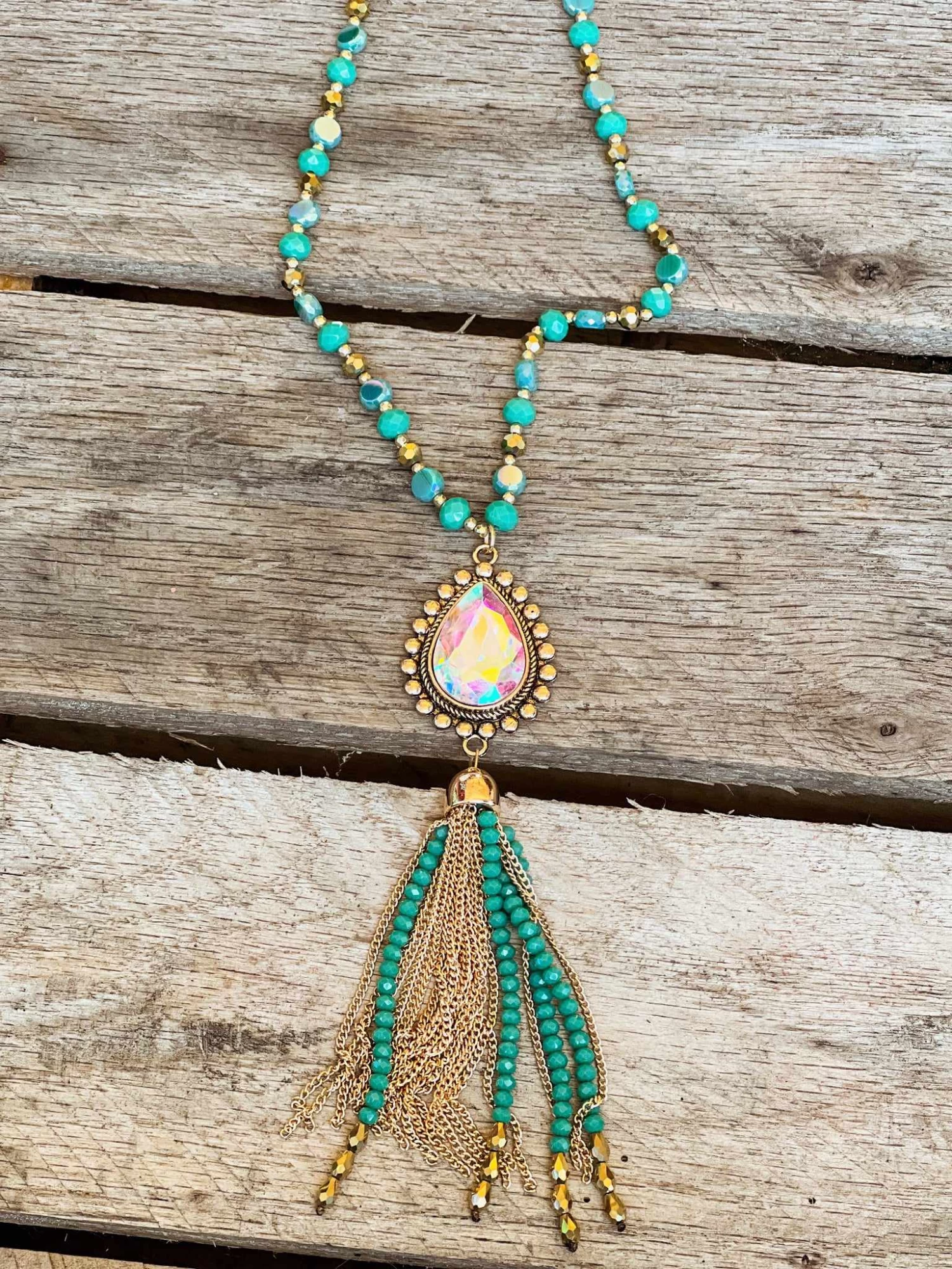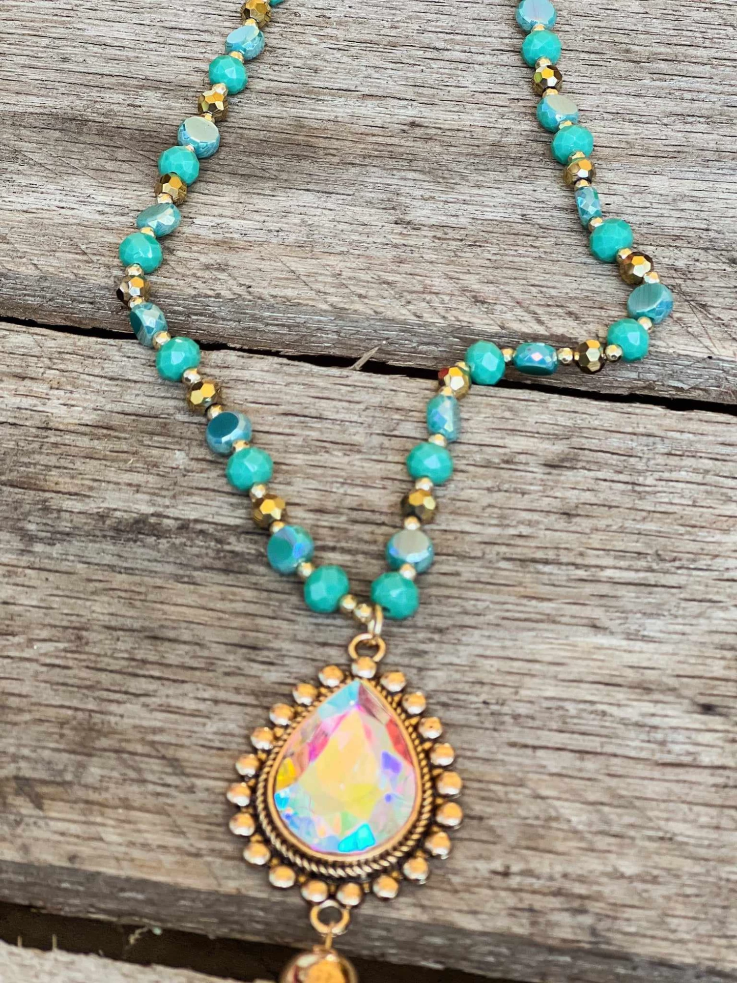 Our gold and turquoise crystal necklace is going to make your eyes pop no matter their color. And, it might just make other folks eyes pop too — right out of their faces when they see how bright you sine!