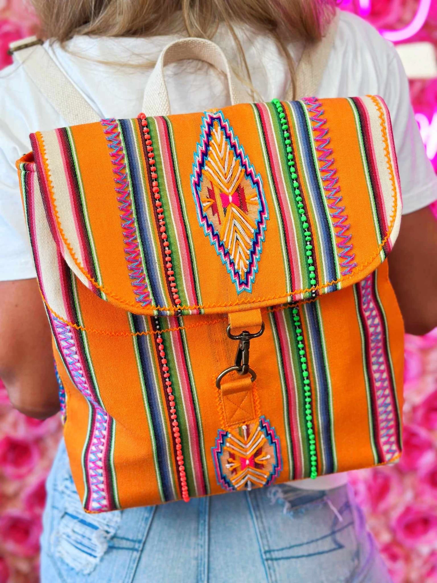 Adventure awaits when you strap on this cute orange striped western style backpack! The perfect backpack style purse to bring along on your summer vacay, this backpack has tons of storage to carry everything you need far from home. Featuring a striped aztec print, canvas material, and adjustable straps.