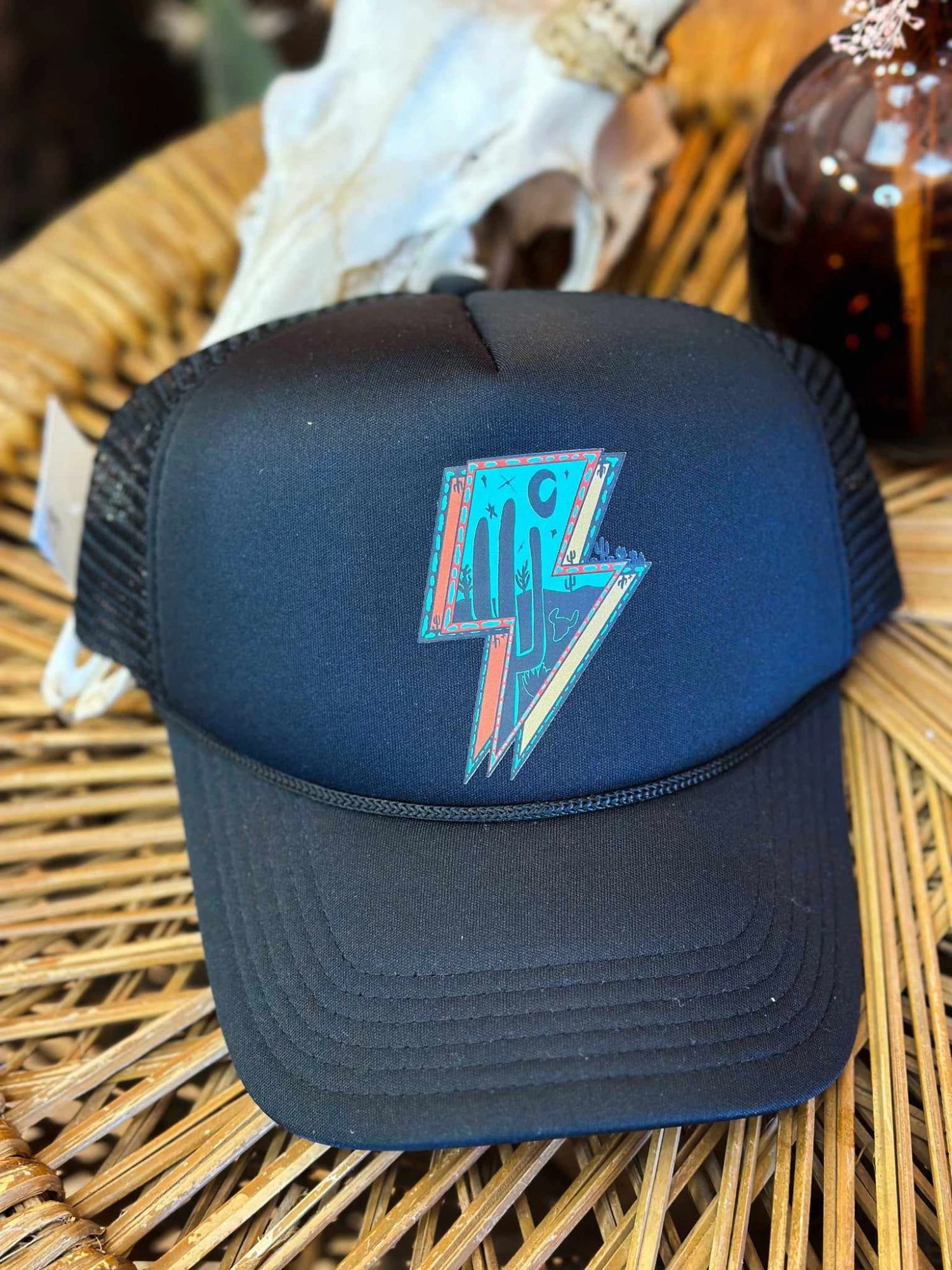 Western Bolt! The trucker hat for everyone! This hat gives off all the western punchy vibes! This hat features a very detailed lightening bolt! Inside the lightening bolt has a desert scene with a cactus, stars, moon and other small images! So cute and unique! Black Trucker hat with black mesh back for breathability! Adjustable and fits most! Screen printed.